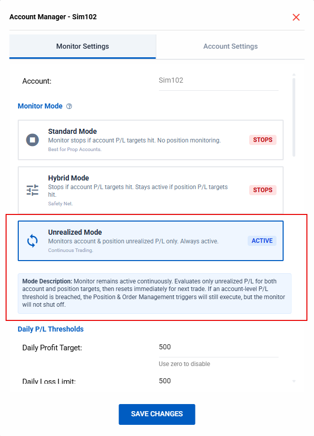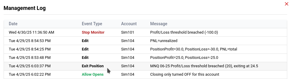 Once the position's P&L crosses above the Profit Threshold or below the Loss Threshold, the position is flattened immediately and the event is reported and logged in the Account Management logs. The Monitor will remain active and continue evaluating any other account- or position-level profit/loss settings.