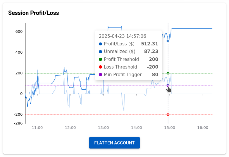 When Unrealized Mode is enabled, a new unrealized P&L "shadow" line will be visible on the Session Profit/Loss graph after you click on an account in the Account Management list. The unrealized shadow line is now the trigger line responsible for flatten actions or drawdown activation, whereas the solid blue line shows the overall session profit/loss.