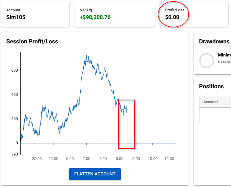 At 7:00 AM ET, I closed the position manually for approximately a $300 profit. Then, as you can clearly see in the highlight sections, NT8 disregards the Session P&L as a result of that position and the Profit/Loss drops to zero as if it never existed in the first place.