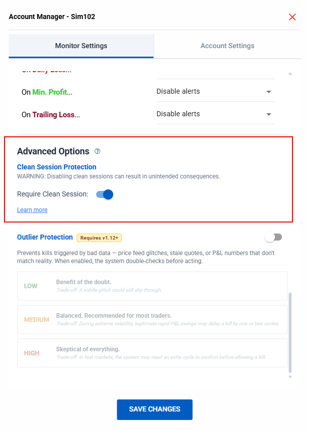 For this reason, by default we require a clean session (session opens with no active positions) for Account Management Monitors to run properly.