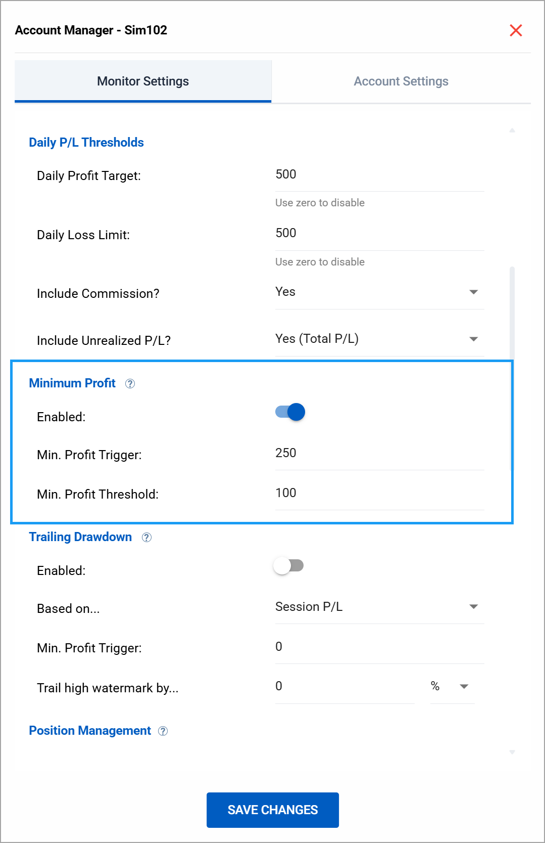 - How to Use: Choose a P&L level that represents the minimum profit you want to keep for the session. For example, if you've triggered monitoring at $500 profit and want to ensure you keep at least $200, set this to 200.00. The Minimum Profit Threshold must always be greater than zero, hence minimum profit.