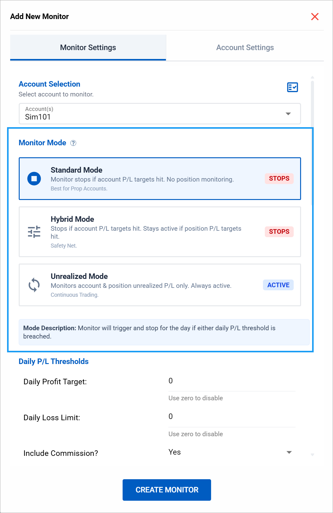 The Account Manager offers three distinct monitor modes, each designed for different trading styles and risk management preferences.