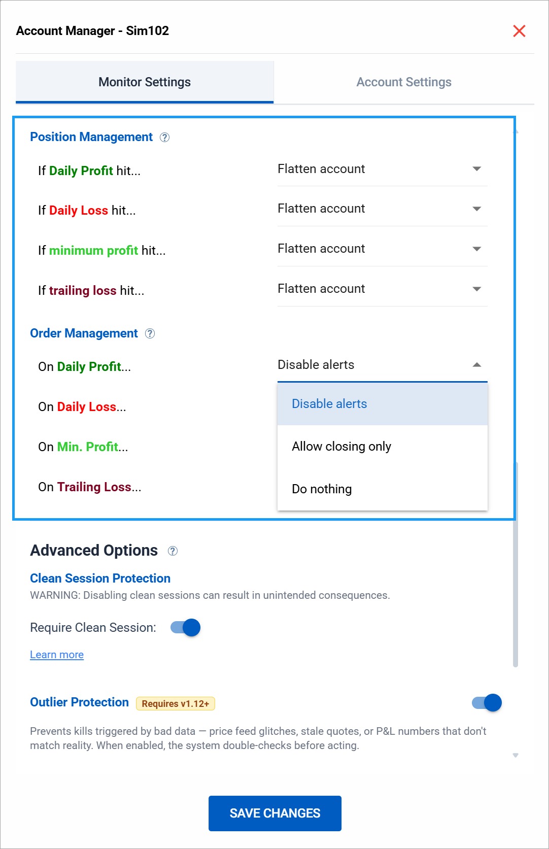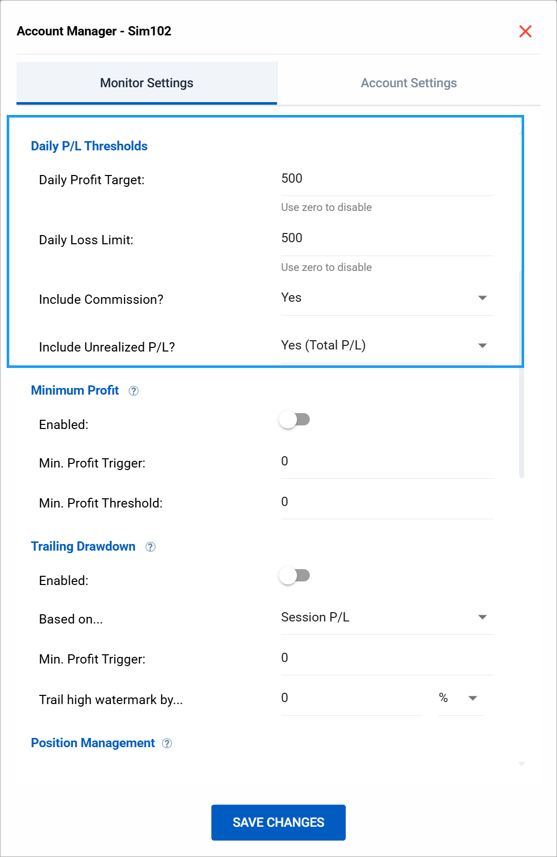 Each monitor includes both a profit and a loss threshold, configurable as a positive or negative dollar amount. When an accountโs real-time P/L breaches either threshold, configured actions such as account flattening and modifications to alert settings will be triggered.