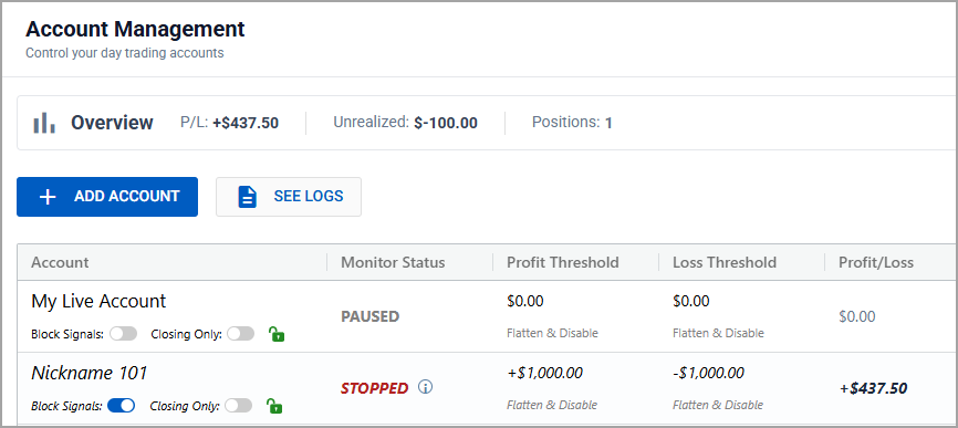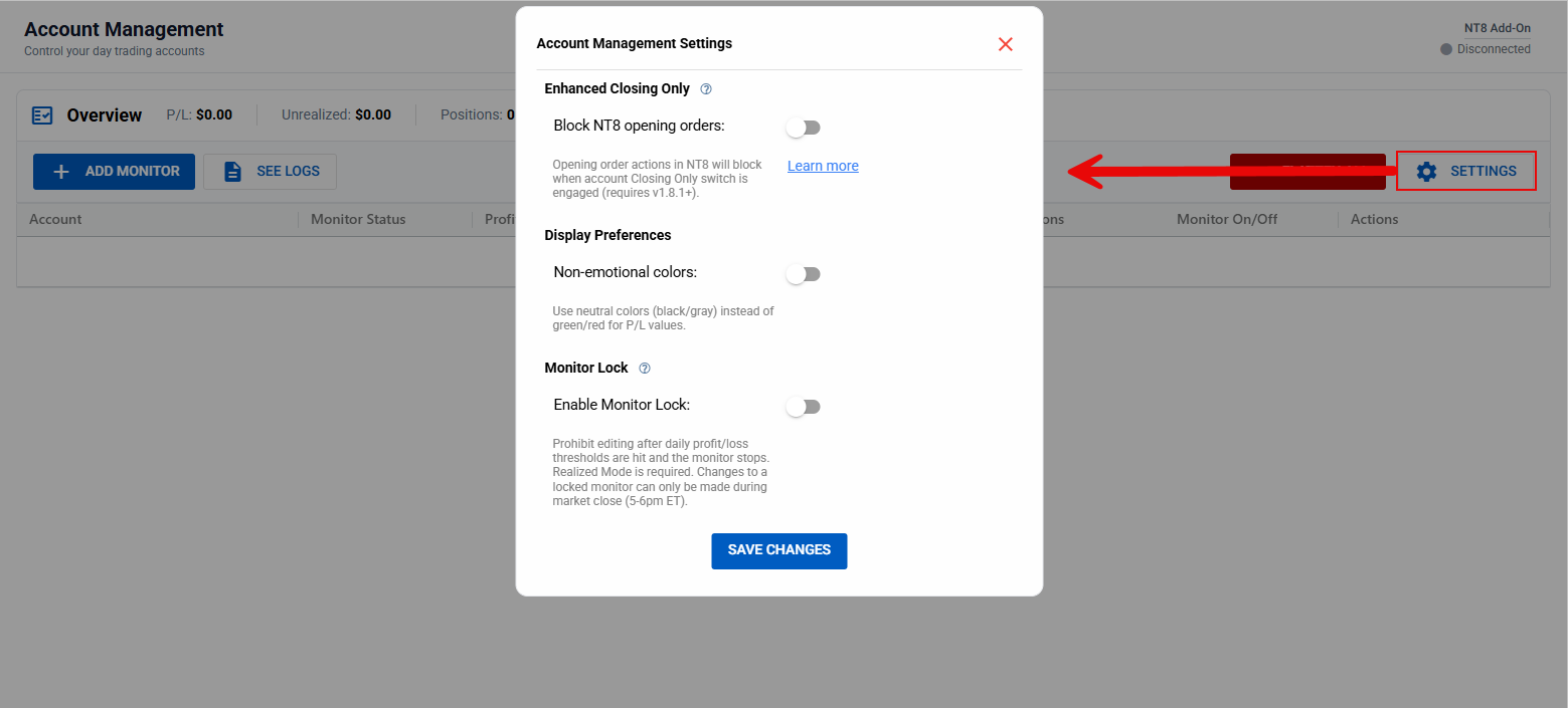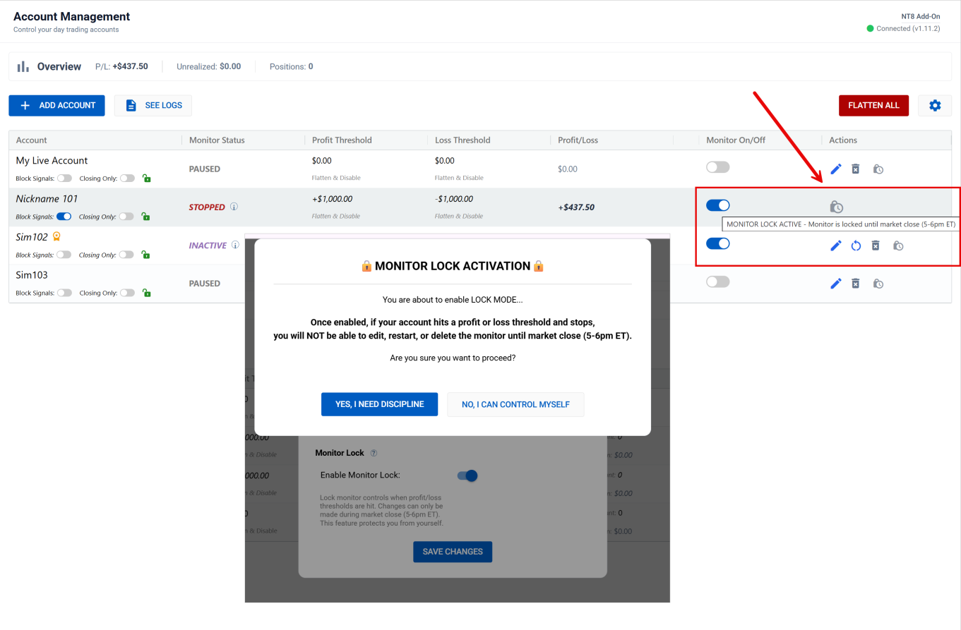 Monitor lock was a heavily requested feature and helps with trader discipline by preventing you from restarting a STOPPED monitor during the trading session. When an account goes STOPPED, you will lose the ability and be "locked out" of the monitor until after the market close at 5pm ET. This feature ONLY applies to STOPPED status... if your account is INACTIVE due to a non-clean session scenario, you are still able to restart manually.