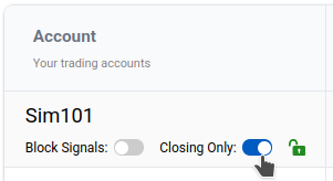 When engaged, use of the Closing Only switch on each sim account in NinjaTrader Account Management will prevent any opening orders from executing, regardless of their origin.