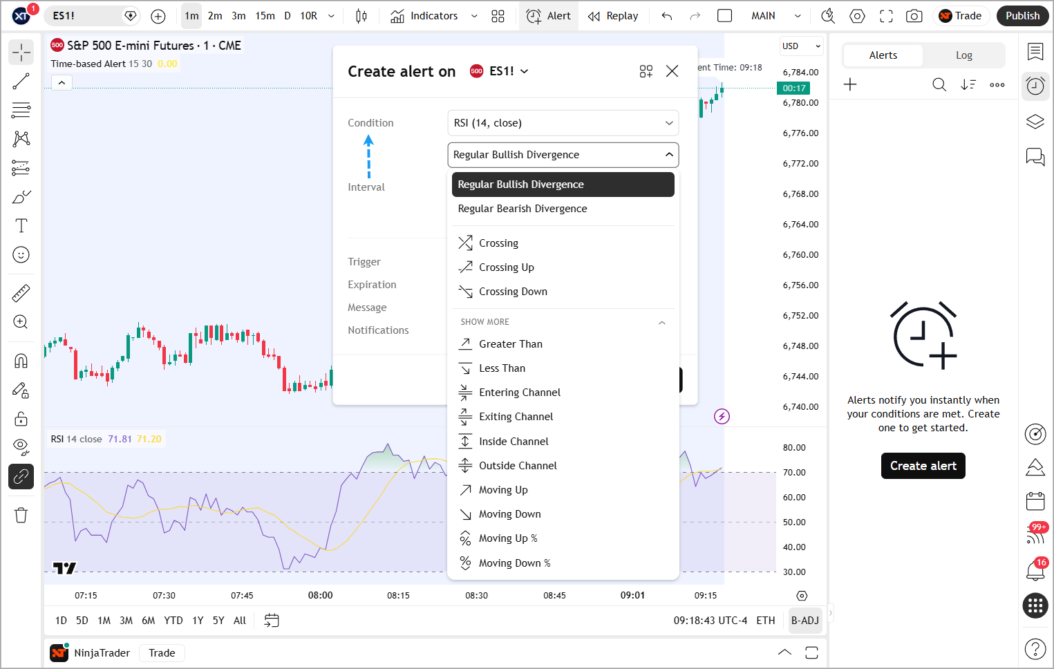 Open a chart with your indicator applied. Create a new alert and set the Condition to your indicator's signal. Most trading indicators expose their buy/sell signals in the condition dropdown. You'll see entries like "Buy Signal" or "Long Entry" depending on how the indicator author named them.