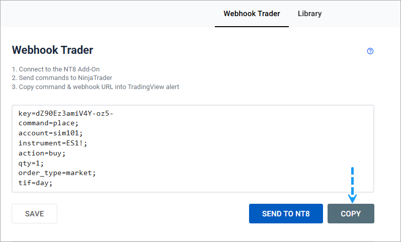 To make life easy you can simply copy the preloaded message in your Webhook Trader. Your secret key is already provided with all of the Command Examples on the Webhooks dashboard.