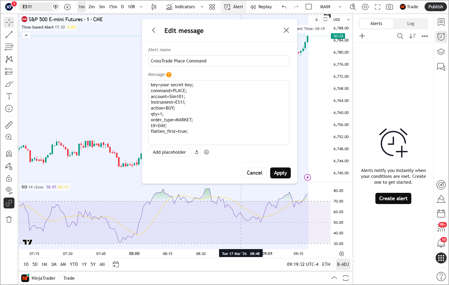In the message field you will supply the payload information you want to send to CrossTrade for relay to NinjaTrader. You can customize this however you want based on the methods NinjaTrader will accept.