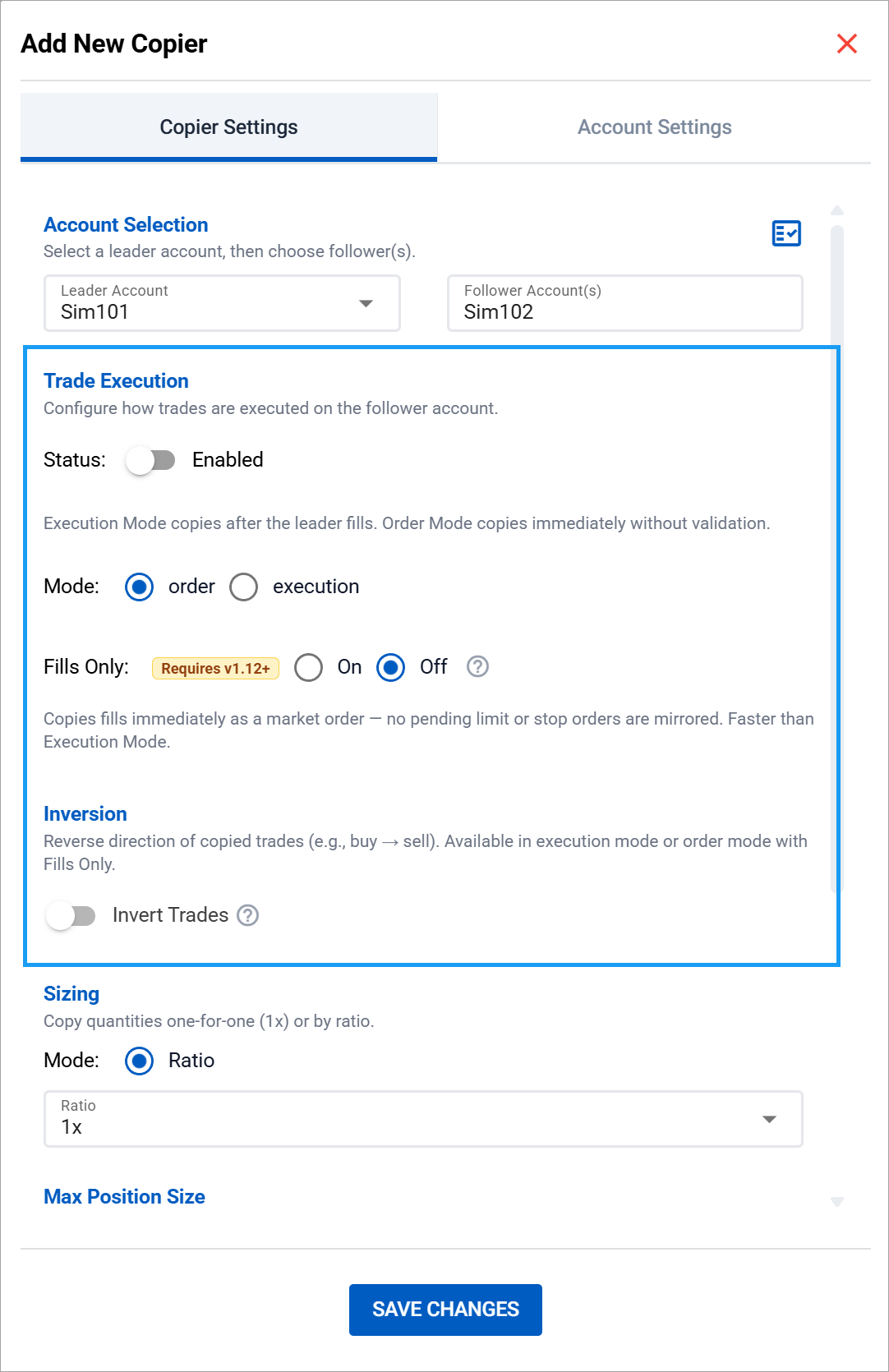 Fills Only also enables trade inversion in order mode — because you're only copying discrete fill events rather than managing a mirrored order book, the copier can safely flip the direction on each fill without the complexity of inverting resting orders.