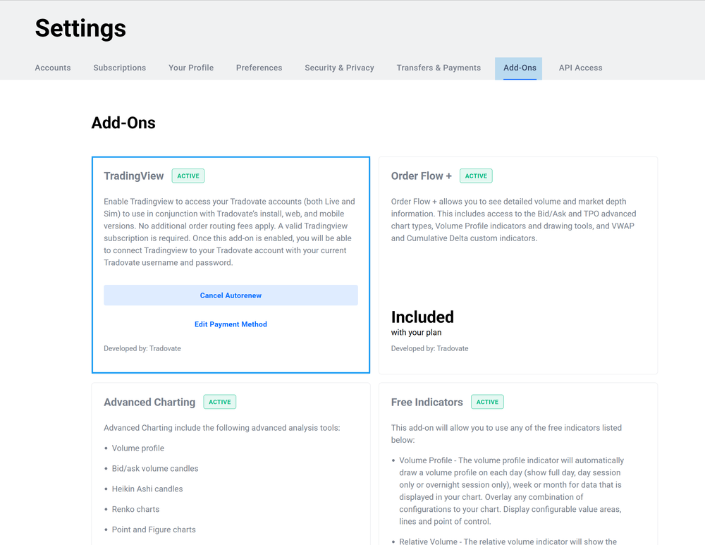 First, you'll need a TradingView Add-on subscription through NinjaTrader. The cost for this add-on is $9.99 per month and you can enable by: