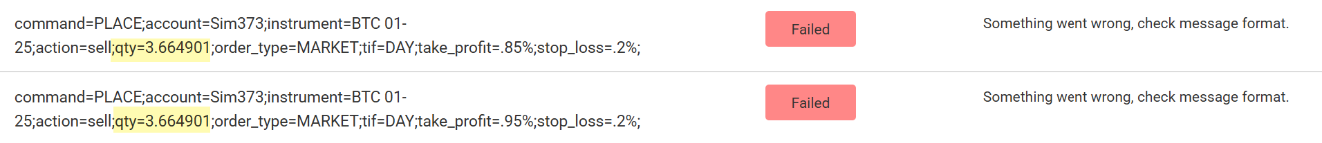This error message is usually an indication that you have supplied a partial contract amount; which NinjaTrader does not support. In the example below you can see 3.664901 is the qty for this command, which NT8 rejects.