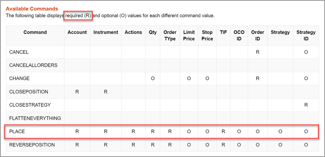 NinjaTrader's available commands require (R) certain fields be present for the command to be implemented.