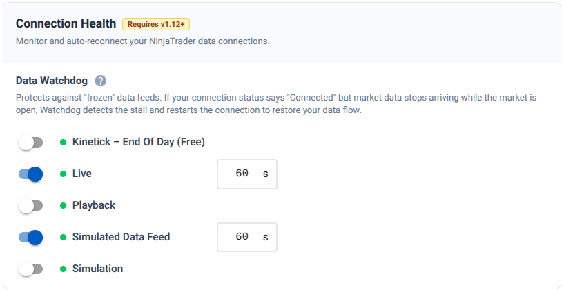 The Data Watchdog monitors a reference instrument's price feed (usually the ES front-month contract) for each broker connection and triggers a reconnect when data stops moving. This catches a class of problems that a simple connection status check misses. Your connection may show as "Connected" in NinjaTrader, but the price data has silently stopped updating.